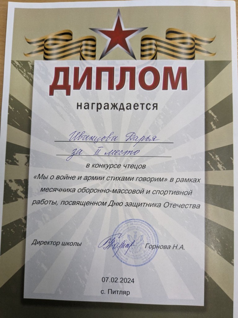 Диплом обучающейся 9 класса Иванцовой Дарьи за второе место в конкурсе чтецов «Мы о войне и Армии стихами говорим» в рамках месячника оборонно-массовой и спортивной работы, посвящённом Дню защитника Отечества. МБОУ – Питлярская СОШ «ОЦ». 2024 г.