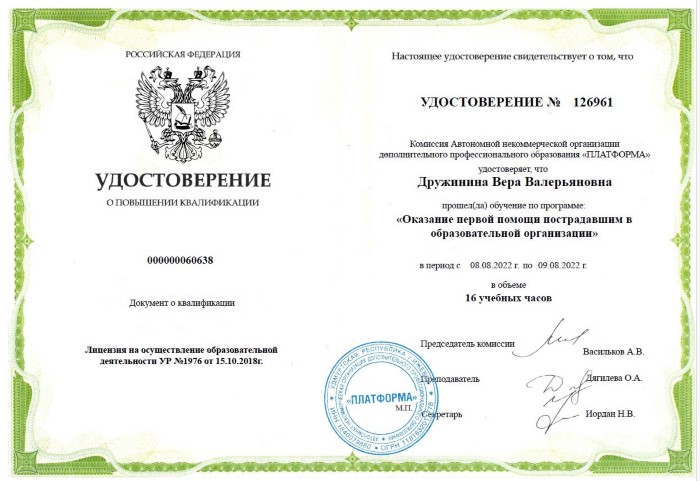 КПК «Оказание первой помощи пострадавшим в образовательном учреждении», 16 ч., Удостоверение 00000060638, 2021 г., ГАУ ДПО ЯНАО "РИРО"