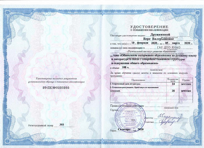 КПК "Обновления содержания образования по русскому языку и литературе в связи совершенствованием структуры и содержания общего образования", 108 ч., 2020 г., ГАУ ДПО ЯНАО "РИРО"