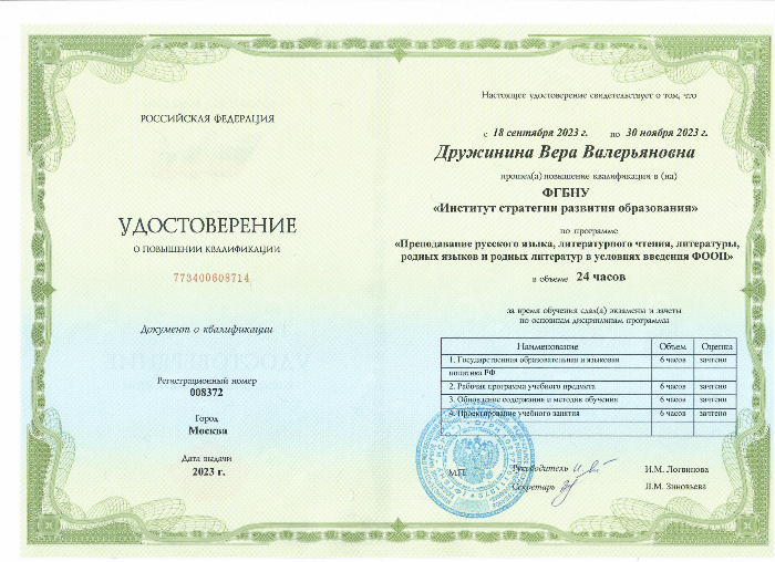 КПК "Преподавание русского языка, литературного чтения, литературы родных языков и родных литератур в условиях введения ФООП, 24 ч., 2023 г., ФГБНУ "Институт стратегии развития образования", Москва