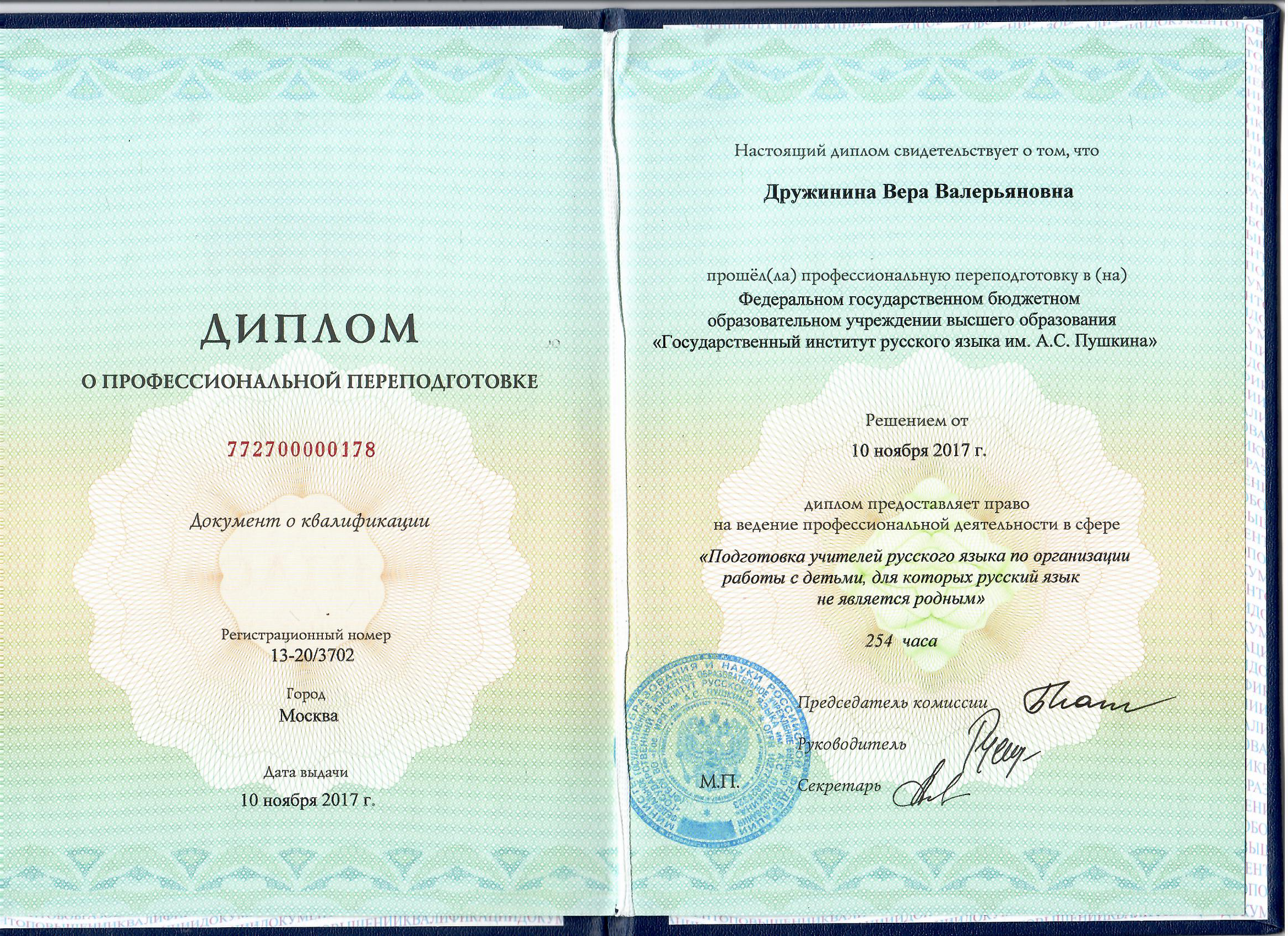 Федеральное государственное бюджетное образовательное учреждение высшего профессионального образования «Государственный институт русского языка им. А.С.Пушкина» по программе «Подготовка учителей русского языка по организации работы с детьми, для которых русский язык не является родным», 2017.