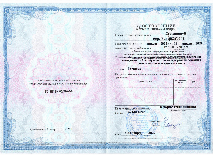 КПК «Методика проверки заданий с развёрнутым ответом при проведении ГИА по образовательным программам основного общего образования (русский язык)» , 2022 г., ГАУ ДПО ЯНАО "РИРО"