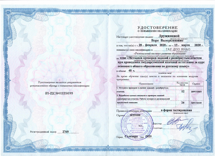 КПК "Методика проверки заданий с развернутым ответом при проведении ГИА за курс основного общего образования по русскому языку", 48 ч., 2019 г., ГАО ДПО ЯНАО Региональный институт развития образования г.Салехард, Удостоверение