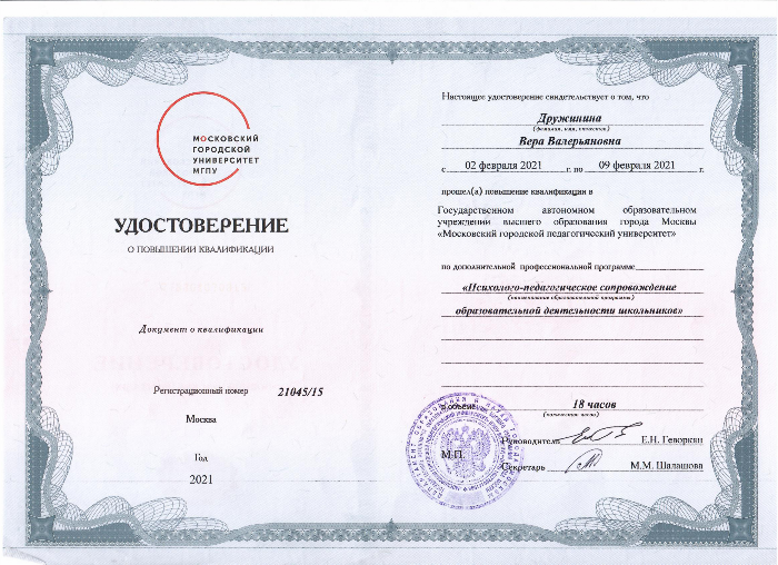 КПК «Психолого-педагогическое сопровождение образовательной деятельности школьников», 18 ч., Удостоверение (21045/15) ГАОУ высшего образования г.Москвы «МГПУ», 2021 г.