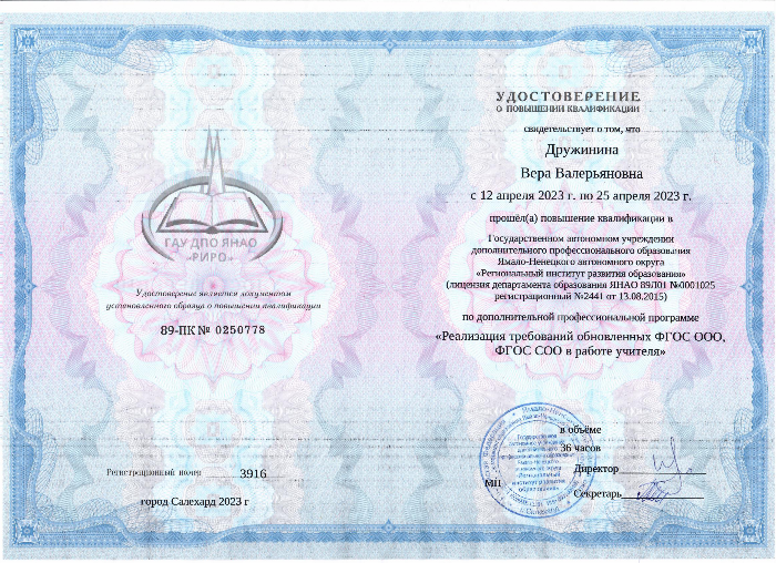 КПК "Реализация требований обновленных ФГОС ООО, ФГОС СОО. Русский язык", 36 ч., 2021 г., ГАУ ДПО ЯНАО "РИРО"КПК «Реализация требований обновленных ФГОС ООО, ФГОС СОО в работе учителя», 2023 г., ГАУ ДПО ЯНАО "РИРО", Удостоверение 89 –ПК№0250778