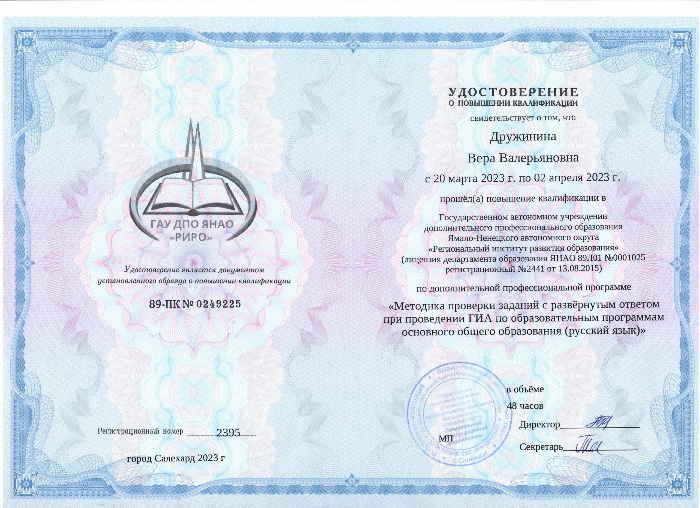 КПК «Методика проверки заданий с развёрнутым ответом при проведении ГИА по образовательным программам основного общего образования (русский язык)», 2023 г., ГАУ ДПО ЯНАО "РИРО"