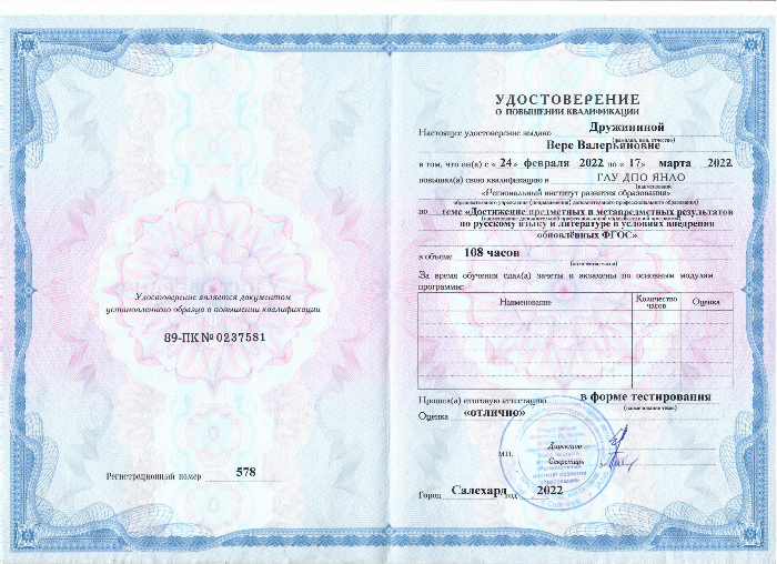 КПК «Достижение предметных и метапредметных результатов по русскому языку и литературе в условиях внедрения обновленных ФГОС», Удостоверение 89-ПК№0237581 регистрационный номер 578 (108 часов), 2022 г., ГАУ ДПО ЯНАО РИРО